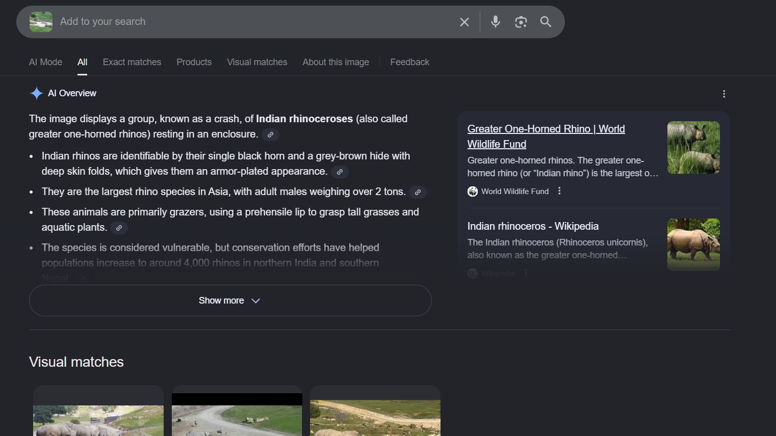 The top results are heavily influenced by AI-generated descriptions, repeatedly identifying the animal as an: