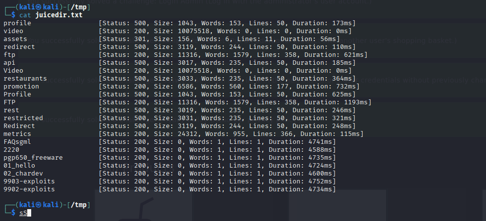 here we can see a common file size so maybe we can add the filter -fs to ignore a common file size. in our case 80117 So lets update our command but because there might be a large amount of endpoints lets make sure we save this to a file. So we will add > juicedir.txt so we will be saving all our endpoints to this file.