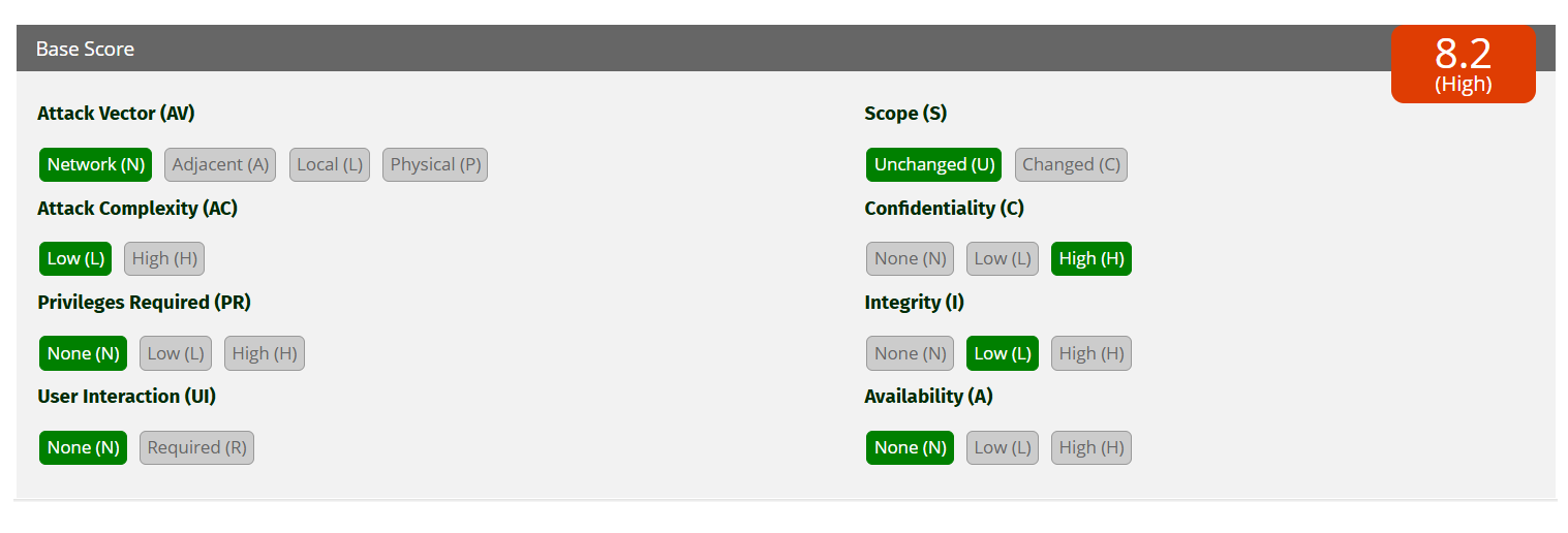 CVSS Vector: CVSS:3.1/AV:N/AC:L/PR:N/UI:N/S:U/C:H/I:L/A:N