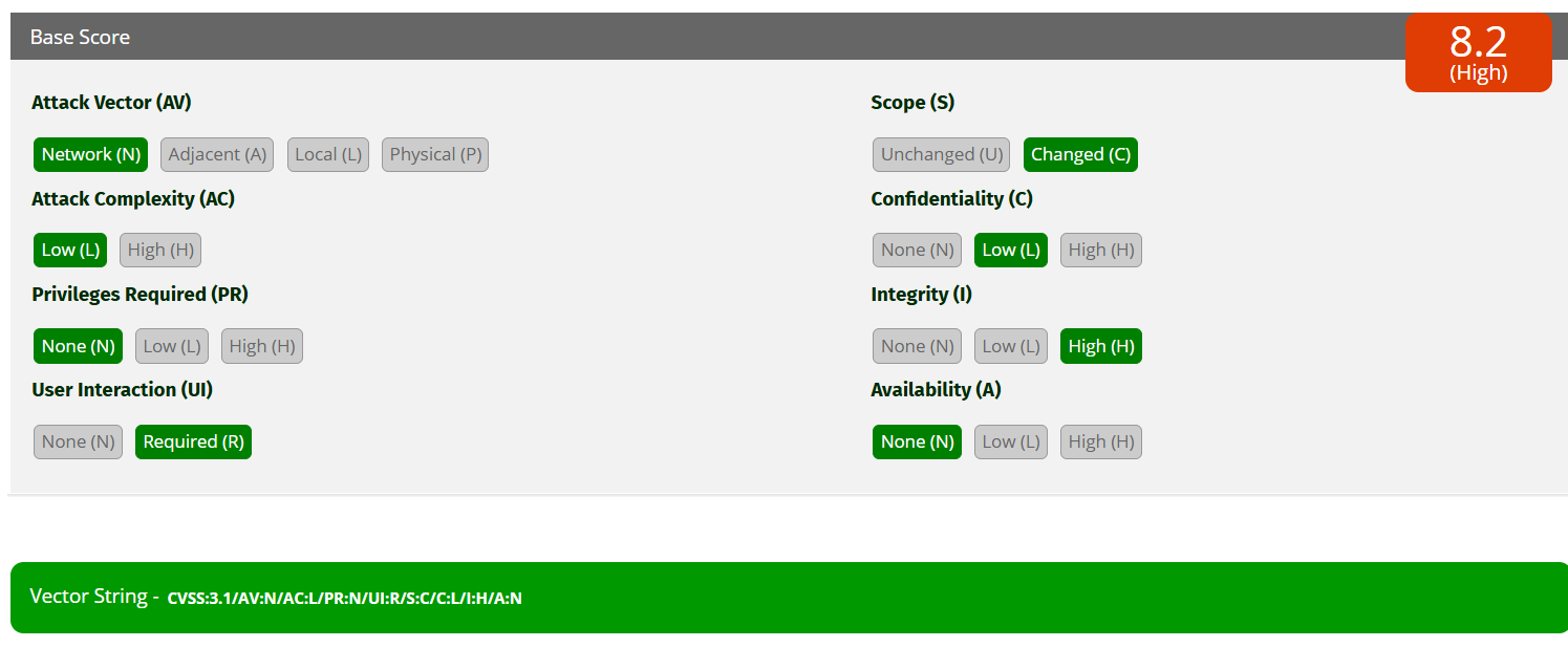 🔐 Vector String: CVSS:3.1/AV:N/AC:L/PR:N/UI:R/S:C/C:L/I:H/A:N