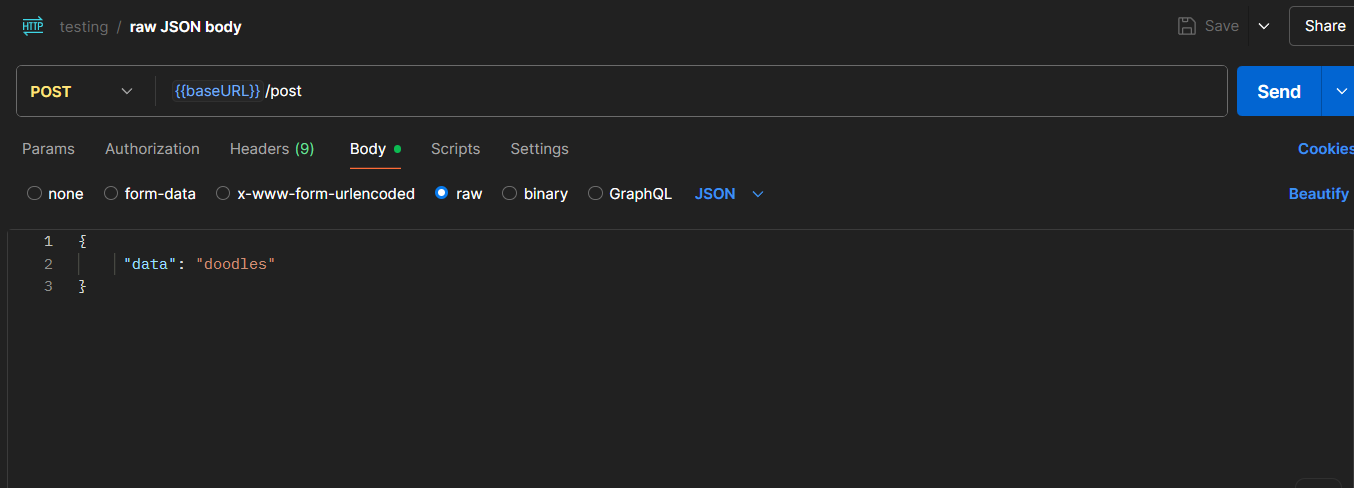 so we should use our parameters from last time {{baseURL}} and we will make this a /POST request and we will put some random data like this