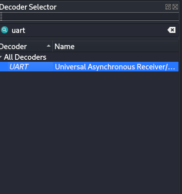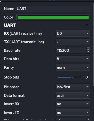 - Add a UART decoder in the tool and configure it for the usual serial parameters (baud/parity/stop bits).