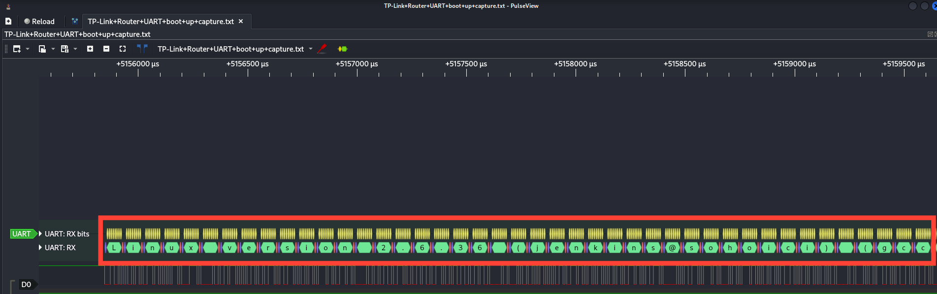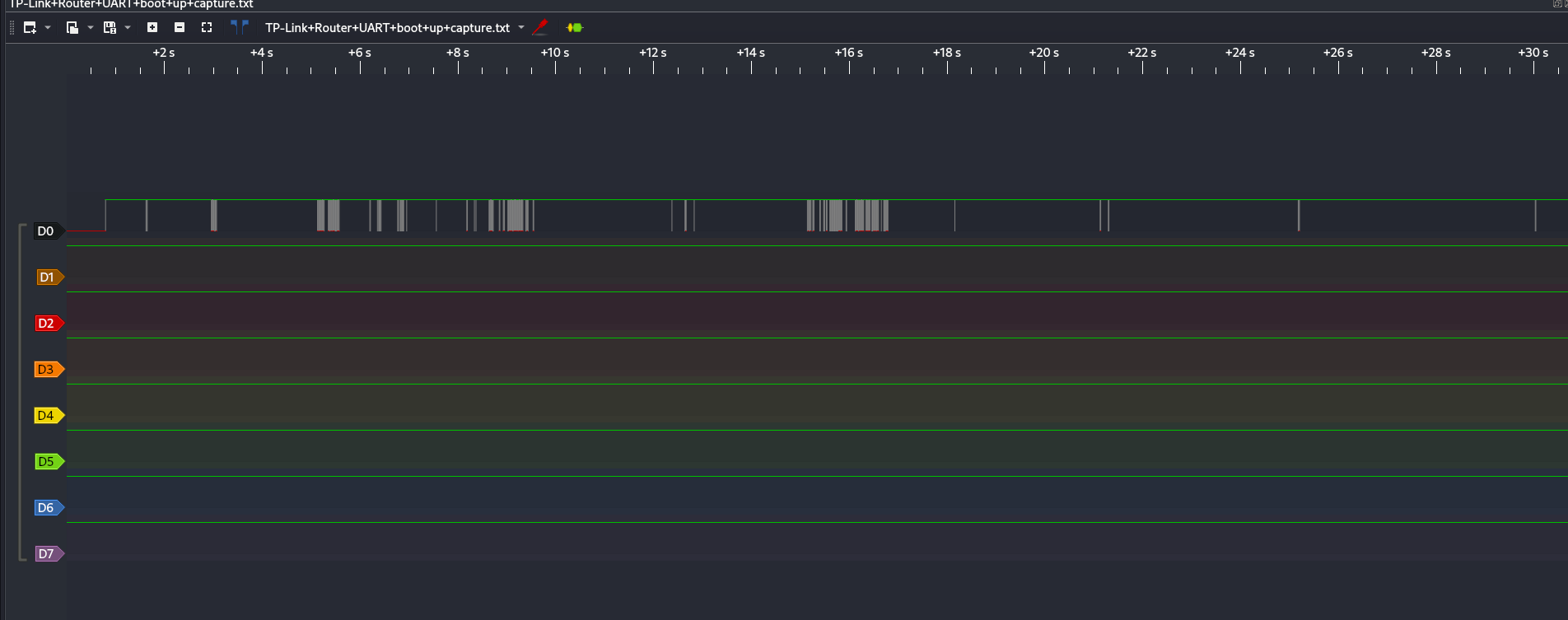 Next, capture the router’s boot. Attach a logic analyzer or UART adapter to the serial pins, power the device, and record the first 10–20 seconds of boot. In tools like PulseView you’ll see waveforms — those are the device talking.