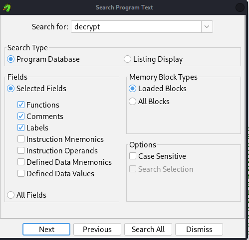 so lets look for something like "decrypt" in the search section