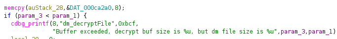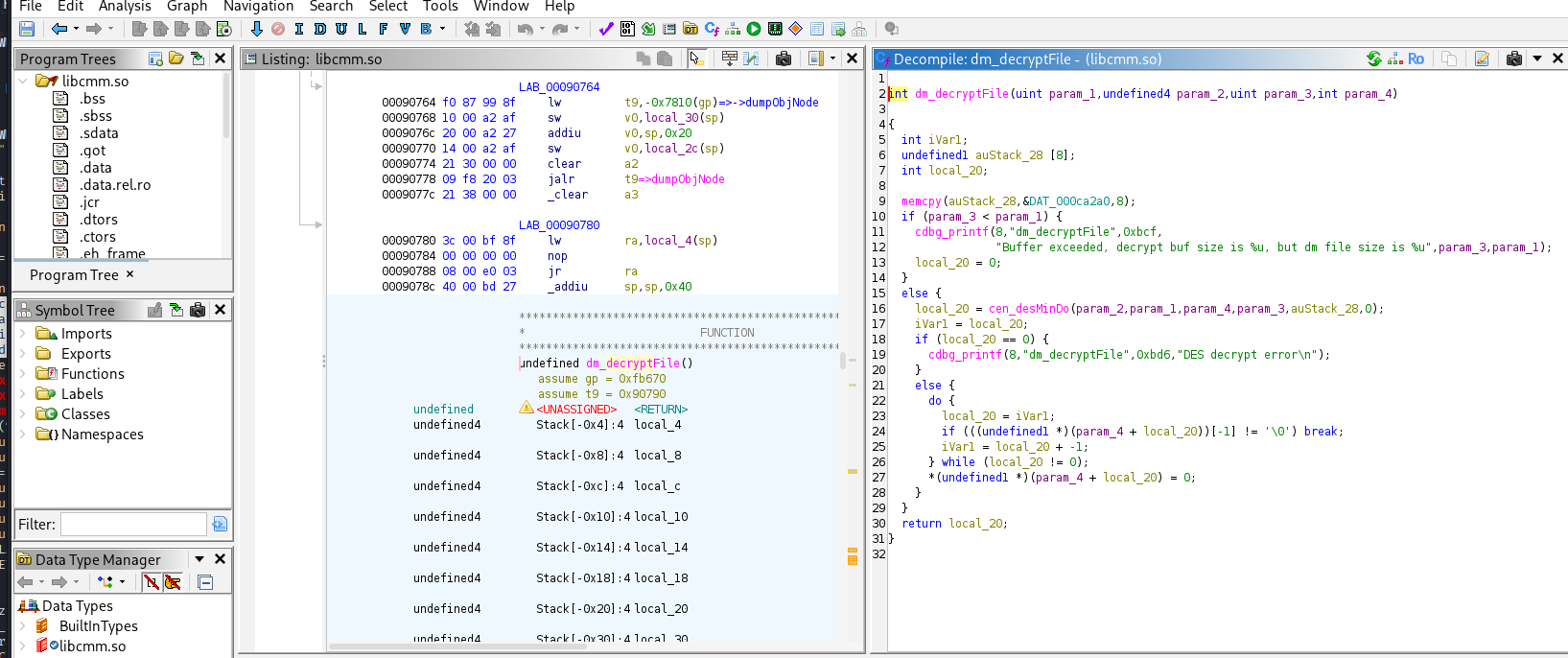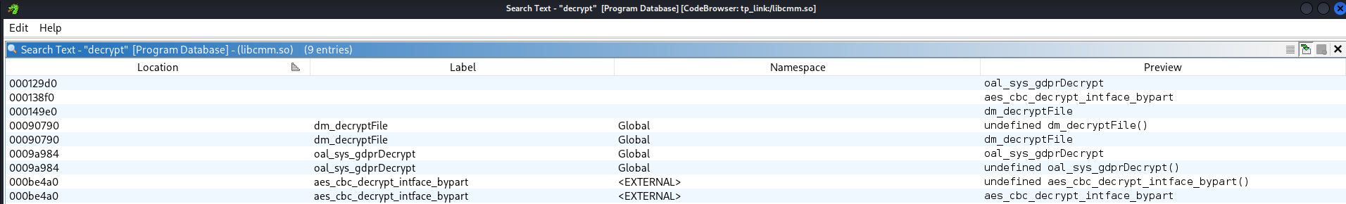 If you find a binary routine that looks like decryption, load it into a disassembler/RE tool and search for likely function names (e.g., decrypt, dm_decryptFile, or other vendor-named helpers). The goal is to: