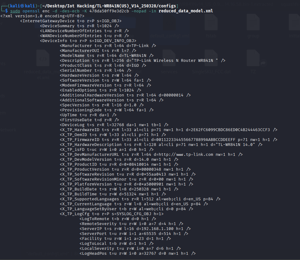 - Hardcoded keys or weak encryption in firmware mean attacker with a firmware image (or device access) can decrypt sensitive config material.