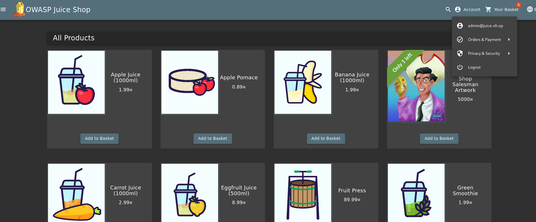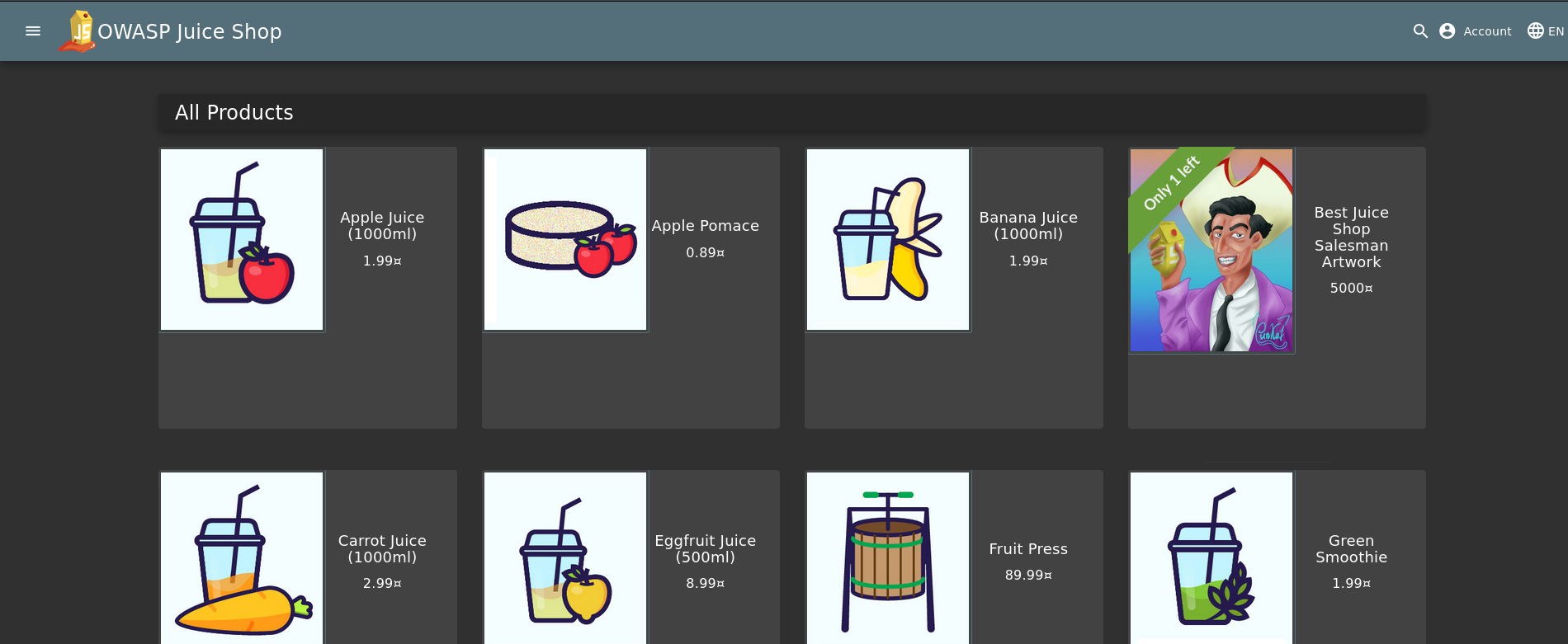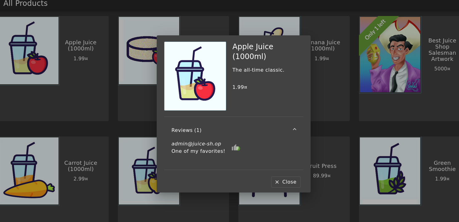 Once I landed on Juice Shop, I saw a list of purchasable items. Naturally, I clicked around and spotted an Apple Juice product with a user review.