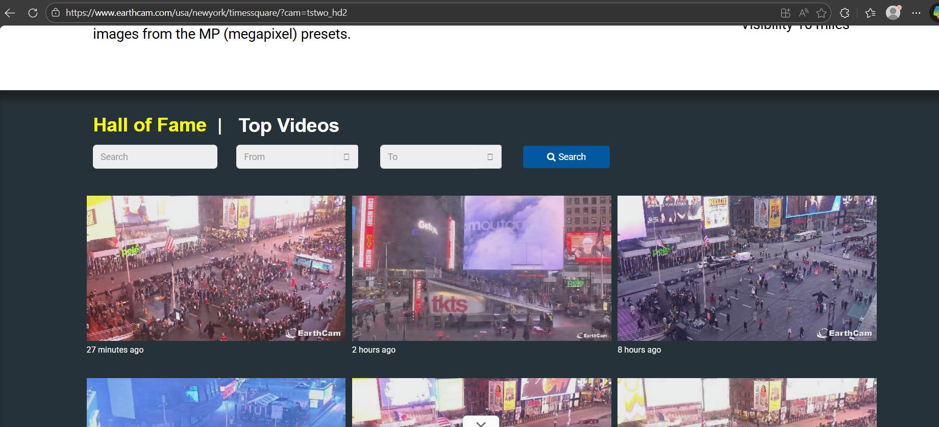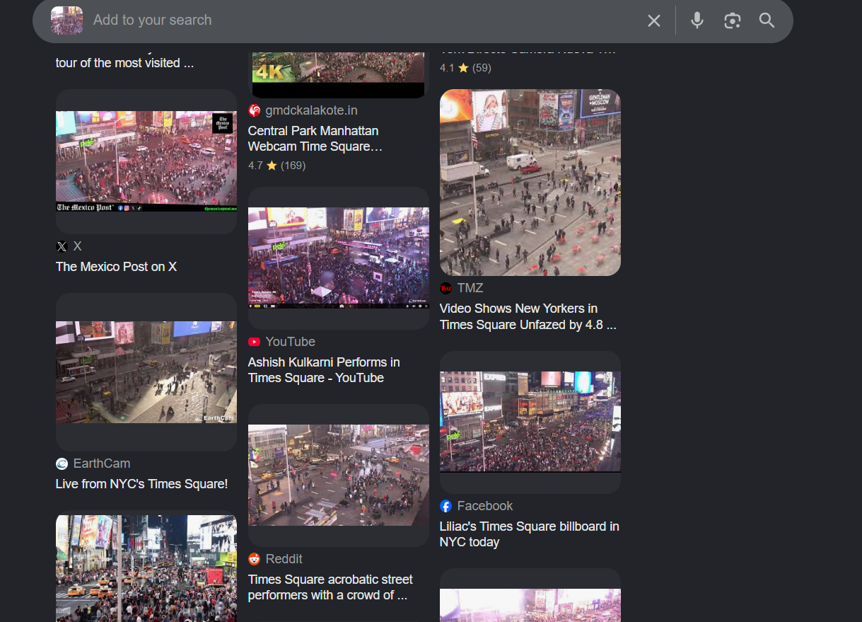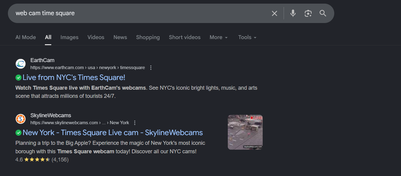 Next, I searched for “Times Square webcam”, which surfaced multiple providers. I selected EarthCam because: