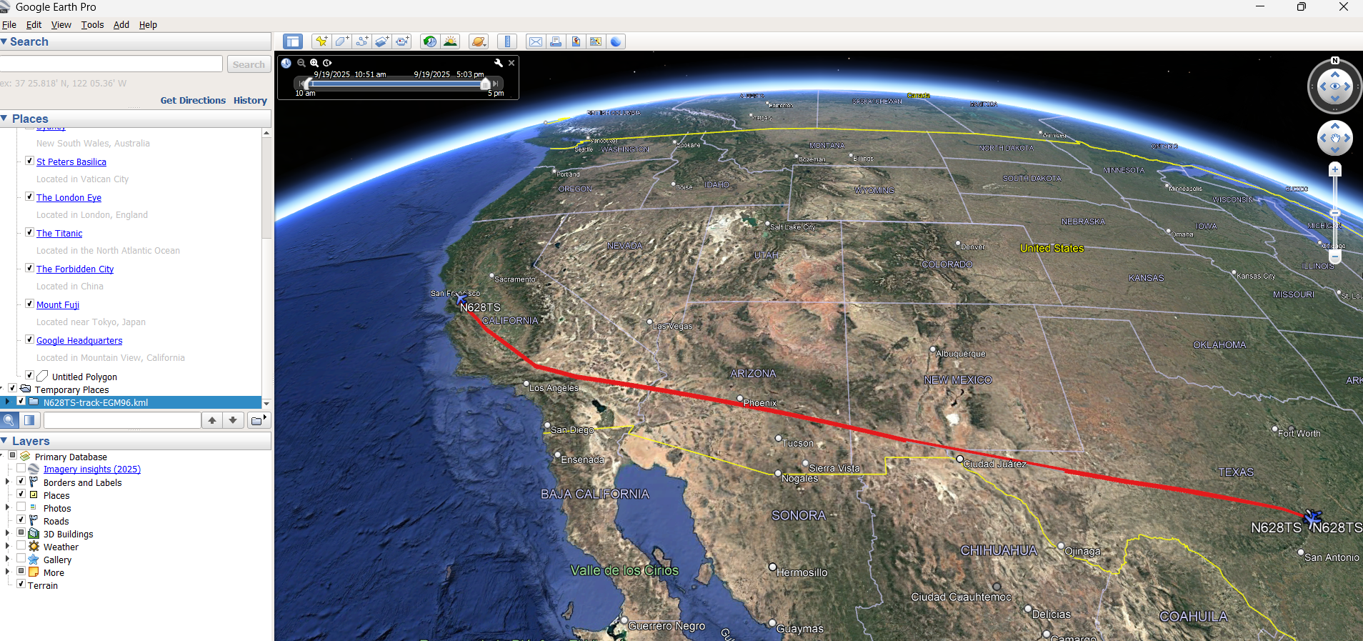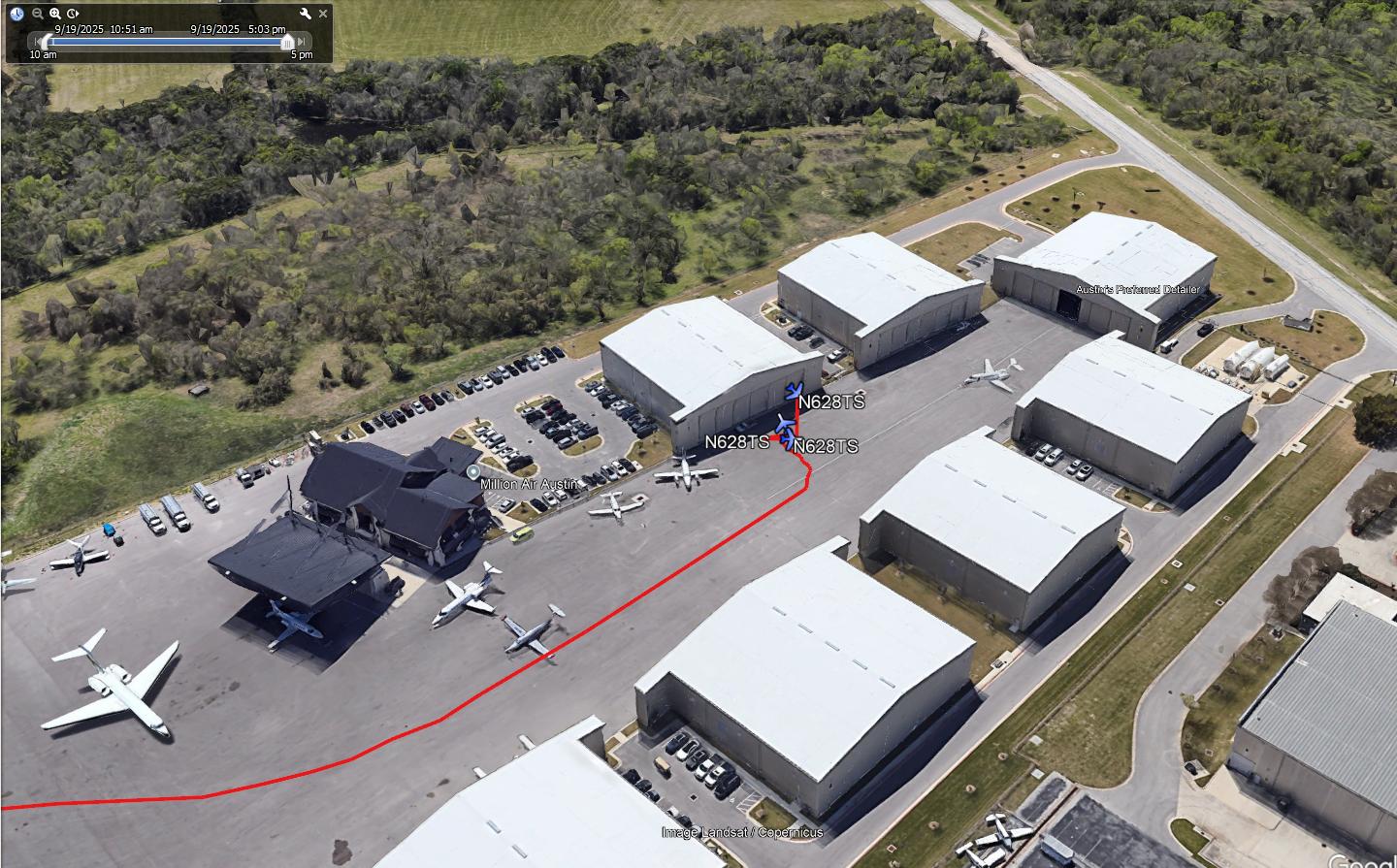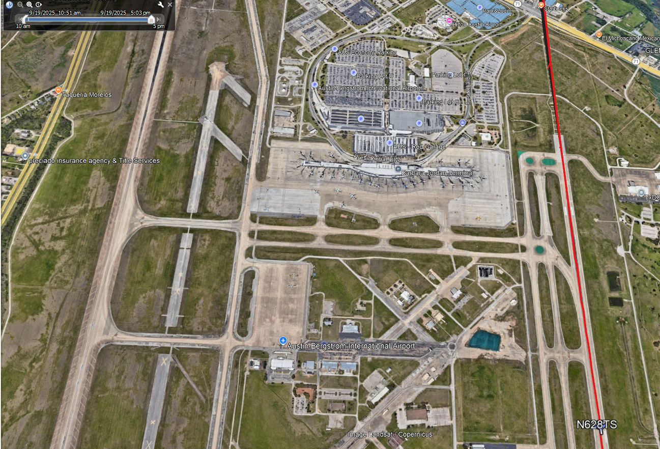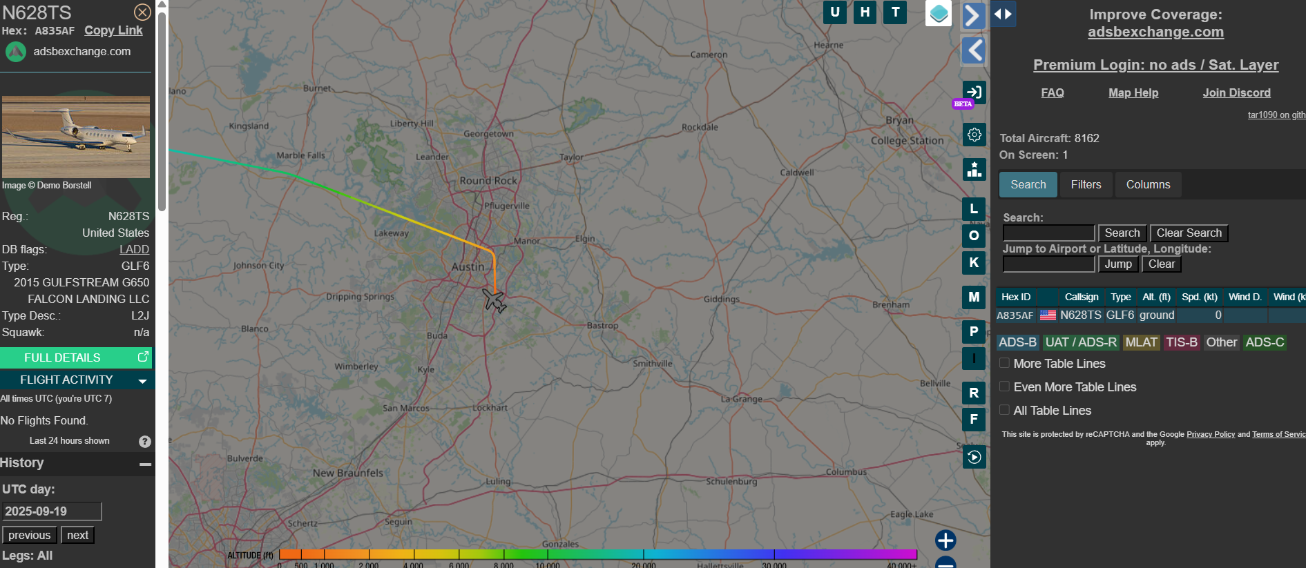 What airport did Elon Musk’s private jet (Tail # N628TS) land at on September 19, 2025?