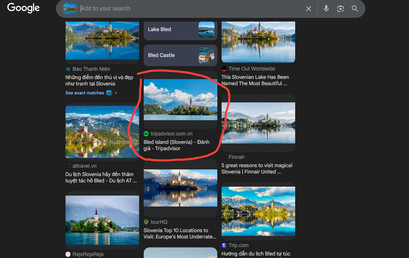 Observation: One of the top results shows “Bled Island (Slovenia)”. That’s a strong clue — especially since it features the same iconic island with a church and surrounding mountains.